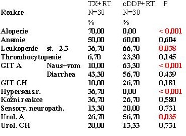 V naší studii jsme potvrdili dobrou toleranci aplikované kombinované léčby u skupiny námi léčených pacientek s pokročilým spinocelulárním karcinomem děložního čípku.Byla prokázána odlišná toxicita léčby způsobená aplikovaným cytostatikem, nebyly pozorovány žádné závažné komplikace, které by vznikly následkem léčebné strategie.U žádné pacientky nebyla toxicita důvodem k přerušení terapie.