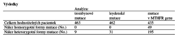 DNA byla izolována na automatickém izolátoru Quiagen. Vlastní detekce proběhla v laboratořích Onkologického centra J.G. Mendela Nový Jičín a hematologické laboratoři VFN s využitím multiplex PCR reakce s následnou RFLP. Koagulační vyšetření provedla hematologická laboratoř VFN, Praha. Závěr: Mutace v genu MTHFR je velmi častou abnormalitou pozorovanou u více než poloviny studovaných osob. Naproti tomu mutace v genech pro faktor II a V jsou poměrně vzácným nálezem v populaci českých žen s karcinomem prsu. Chceme prezentovat četnost genetických trombofilních poruch v populaci pacientek s karcinomem prsu ve srovnání s koagulačním nálezem a klinickými obtížemi nemocných. Poděkování: Studie byla vytvořena s podporou grantu Ligy proti rakovině Praha.