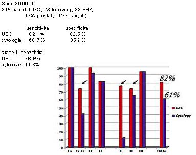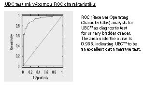 UBC: senzitivita 80,5%, specificita 80,2% , po vyloučení 23 pac. s uroinfekcí a oněm. prostaty byla specificita 87,1%.