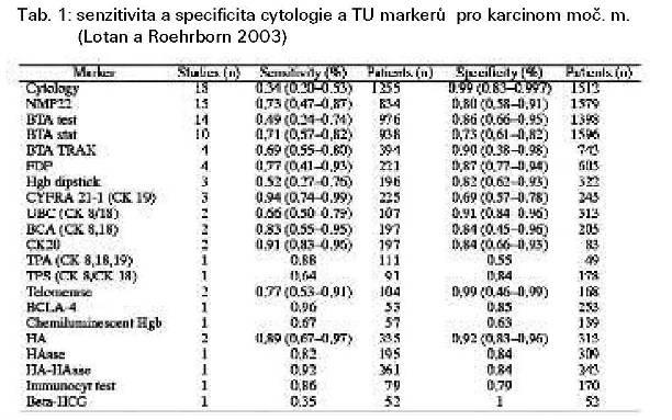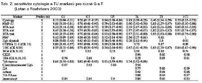 Lotan a Roehrborn v metaanalytické studii v r.2003 [3] při srovnávání studií celé řady markerů pro CA moč. m. ukázali, že většina těchto markerů má ve srovnání s cytologií lepší senzitivitu, zvláště u low grade/stage tumorů (tab. 2), ale cytologie má vyšší specificitu (tab. 1).