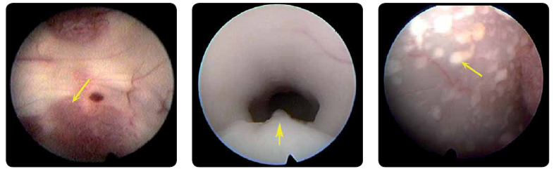 Do souboru bylo zařazeno 16 nemocných, 11 žen a 5 mužů, průměrný věk 51,2 let (16–82 let). Převládali nemocní s postižením obou postranních a III. komory (8 nemocných) a s postižením obou postranních komor bez postižení III. komory. Blokáda mokových cest nádorem byla při neuroendoskopické operaci řešena u 13 nemocných. U 8 nemocných byla neuroendoskopie dostačující, u 5 byl nutný shunt (subarachnoidální nádorový rozsev, rychlá progrese nádoru). Biopsie byla provedena u 14 nemocných a nebyla indikována u 2 pacientů (endoskopický obraz metastázy melanomu, četné drobné uzlíky u nemocné s diseminací karcinomu prsu) (obr. 2, 3). Diskrepantní výsledek byl u jediného nemocného (endoskopie astrocytom gr. II–III, stereotaxe glioblastom). Četnost komplikací endoskopií byla 0 %. U jednoho nemocného bylo nutné odstranit shunt pro infekt. Histologické vyšetření prokázalo metastatické postižení u 4 nemocných, B lymfom u 3 nemocných a glioblastoma multiforme u 3 nemocných.