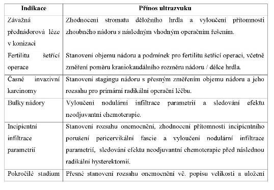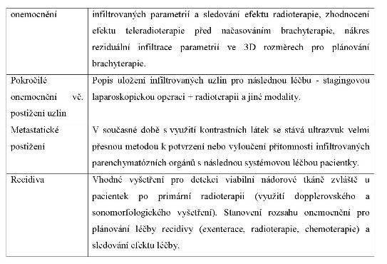Ultrazvukové vyšetření jako jednoduchá, snadno dostupná a levná metoda má velký význam jak při primárním stagingu cervikálního karcinomu, tak při monitorování neoadjuvantní léčby, plánování léčby, vč. brachyterapie a v časné diagnostice rekurence.