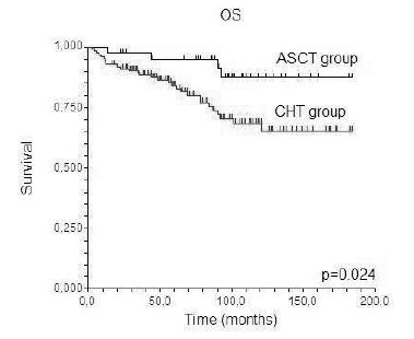 Background. Intensive frontline therapy of follicular lymphoma remains controversial. But in the era of conventional chemoimmunotherapy, long-term progression- free survival of high-risk patients is poor and drops to only 30% in 5 years. Aims. A retrospective analysis of FL patients with unfavorable prognostic features receiving up-front autologous stem cell transplantation and comparison with anthracycline-based regimens. Methods. We studied 164 patients with newly diagnosed FL who met the GELF criteria. Forty (24%) were treated with ASCT (conditioning BEAM 200) due to high-risk disease (FLIPI, B2M, s- TK, bulky). Frontline therapy with chemotherapy only (CHT) was administered to 124 (76%) patients: CHOP/CHOP-like regimen to those with low-risk FL (n=95) and intensive protocol (Promace-Cyta-BOM/adequate intensity protocol) to intermediate-risk patients. Rituximab was added to frontline therapy in 60% and 56% of cases in ASCT and CHT group, respectively (p=ns). Maintenance immunotherapy was applied in 30% (ASCT) and 41% (CHT), p=0.22. ASCT patients shared more unfavorable prognostic features than CHT group: H-FLIPI (66% vs 34%, p=0.001), bulky disease >7cm (81% vs 51%, p=0.001), advanced clinical stage (95% vs 80%, p=0.02), elevated B2M (64% vs 39%, p=0.007). ASCT patients were significantly younger (median age 46 vs 57 years, p<0.01). Results. Complete remission rates were 93% and 81% in ASCT and CHT group, respectively (p=ns). Molecular CR was achieved in 89% of ASCT patients and 81% of CHT group (p=ns). After a median follow-up of 87 months (7.3 yrs), 29/40 (73%) ASCT patients are alive in the 1st CR as compared with only 68/124 (55%) in CHT group. Five-year PFS was 76% (95% CI 0.62-0.90) and 56% (95% CI 0.47-0.66, p=0.018) in ASCT and CHT group, respectively. Five-year overall survival of 95% (95% CI 0.88-1.00) in ASCT group was superior to that of 84% (95% CI 0.77-0.91, p=0.024) in CHT arm. Subanalysis of 93 patients treated with rituximab showed higher proportions of relapses and deaths in CHT group (22 events in 69 patients) than in ASCT group (4 events in 24 patients, p=0.048). Five-year PFS was higher in ASCT (86%, 95% CI 0.71- 1.00) than CHT group (63%, 95% CI 0.51-0.76). Despite 23% difference in 5- year PFS in favor of ASCT, statistical significance was not achieved (p=0.08). There was no difference in OS in rituximab treated patients; only 2 (8%) ASCT patients died as compared to 10 (14%) deaths in CHT group (p=0.13).Longterm toxicity in ASCT arm is acceptable. So far, no secondary MDS or AML have been observed; during the follow-up (median 100 months), only 4 patients died (2 lymphoma, 1 prostate cancer, 1 pneumonia). Conclusions. Frontline ASCT is very effective in high-risk FL patients. This approach overcomes multiple negative prognostic features of the disease and leads to superior survival compared to lower-risk patients treated with chemotherapy only.Supported by grants from Czech Ministry of Education (MSM 6198959205) and Faculty of Medicine and Dentistry, Palacky University Olomouc (LF-2011-006).