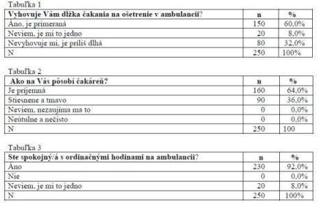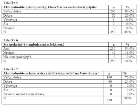 V našom prieskume sme sa zamerali na samotných pacientov, na úroveň ich spokojnosti s poskytovanou zdravotnou a ošetrovateľskou starostlivosťou, prístupom zdravotníckeho personálu, na problematiku informovanosti o svojom ochorení, na schopnosti sestry a lekára odpovedať na otázky pacientov. Čakacie doby, ošetrovateľská starostlivosť a iné faktory sú pre nich rovnako dôležité ako samotná liečba a ošetrovateľská starostlivosť.