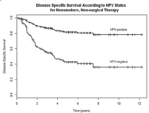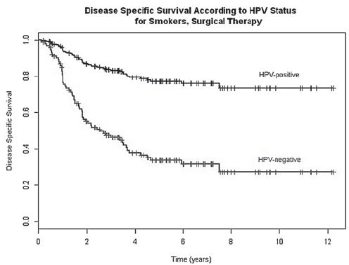 Ve studii byla porovnávána úspěšnost chirurgické a konzervativní léčby u pacientů s pokročilou formou orofaryngeálního karcinomu. Pacienti s HPV asociovanými nádory mají významně lepší prognózu bez ohledu na typ léčby. Prognostická výhoda HPV pozitivity pravděpodobně není vázána na léčebnou modalitu. Ačkoliv léčebné protokoly prozatím HPV status nezohledňují, zavedení rutinního testování všech vzorků OFK při verifikaci nádorového onemocnění za účelem detekce HPV je nanejvýš žádoucí.