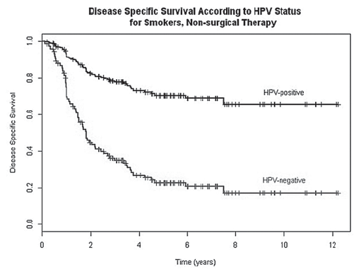 Ve studii, do které bylo zahrnuto celkem 185 pokročilých OFK, byla virová etiologie tumoru zjištěna u 46 % pacientů, z toho v konzervativní větvi u 31 % a v chirurgické u 59 %. Celkové i specifické přežití bylo statisticky signifi kantně lepší u pacientů s HPV pozitivními nádory ve srovnání s pacienty s nádory HPV negativními, a to v obou skupinách – léčené chirurgicky a konzervativně (graf 1, 2). HPV se ukázal jako nejsilnější prediktor celkového i specifického přežívání. Pacienti s HPV asociovanými nádory měli významně lepší prognózu, a to bez ohledu na typ léčby. Pro celkové přežívání bylo dalším významným negativním prediktivním faktorem kouření a hraničně významné bylo pohlaví, pro specifické přežívání byla hraničně významná velikost nádoru a současná konzumace alkoholu. HPV pozitivita byla pozitivním, velikost nádoru a konzumace alkoholu negativním prediktivním faktorem ve specifickém přežívání.