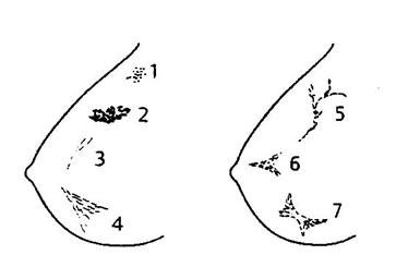 – zhrubnutá koža prsnikovej žľazy;* nepriame príznaky.
