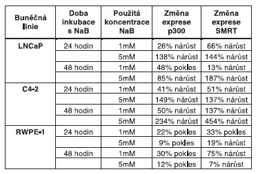 Kvantitativní real-time PCR analýza ukázala, že NaB má vliv na expresi koaktivátoru p300 i korepresoru SMRT a to zejména u prostatických nádorových linií LNCaP a C4-2. U nenádorové linie RWPE-1 NaB ovlivňoval expresi p300 a SMRT podstatně méně. Vliv NaB na expresi těchto dvou koregulátorů AR se liší nejen v závislosti na jeho použité koncentraci, ale také v závislosti na délce působení této účinné látky. Změny v expresi p300 a SMRT u jednotlivých buněčných linií jsou uvedeny v následující tabulce.