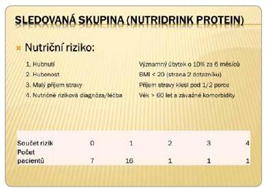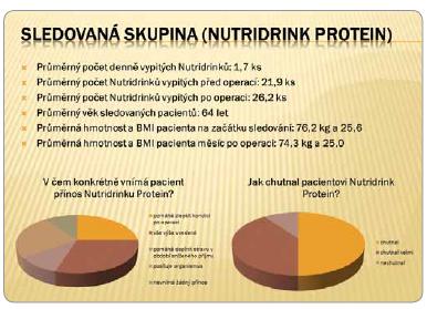 Do projektu byli zařazeni pacienti s kolorektálním karcinomem nebo tumory kolon a rekta s resekcí nebo amputací. Pacientům zařazeným do projektu bylo doporučeno bez ohledu na nutriční riziko nehubnout, jíst pestrou stravu a navíc popíjet mezi jídly 2 x 200 ml Nutridrinku Protein denně, a to minimálně 10 dní před operací a 2-3 týdny po operaci. Hodnocené parametry: 1) Dehiscence rány, dehiscence anastomózy, infekce v ráně, rehospitalizace s příčinnou souvislostí se základní dg. 2) Nutriční riziko před operací, nutriční stav (hmotnost a BMI) před operací a měsíc po operaci, délka hospitalizace. 3) Počet užívaných OND, subjektivní vnímání palatability a přínosu pro pacienta.