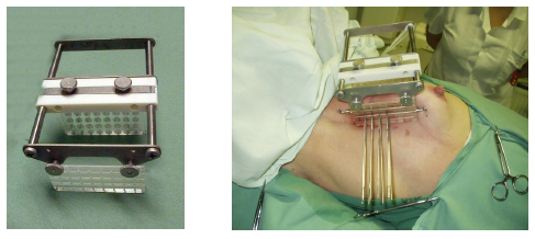 Pokud se rozhodneme pro užití intersticiálního boostu, je nejdůležitějším momentem definovat si adekvátně cílový objem. Ten je definován jako lůžko tumoru s 0,5 - 1 cm bezpečnostním lemem (13). Pro vizualizaci lůžka tumoru je nejspolehlivější peroperační umístění 4 - 6 kontrastních kovových klipů, které vymezují boční, předozadní, dolní a horní okraj kavity a jejich rtg lokalizace. Přesnější variantou je lokalizace klipů pomocí CT či MRI plánovacích řezů, přičemž titanové klipy uložené na hranici kavity jsou v jednotlivých řezech přesně vizualizovány (14 - 15). Tento postup umožňuje redukovat objem ozářené tkáně a takto precisně provedený boost zlepšuje lokální kontrolu nádoru. Titanové klipy přitom nijak nemění kvalitu diagnostického CT či MRI obrazu ani dávkovou distribuci radioterapie (15).