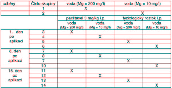 Bylo použito celkem 70 pokusných zvířat (samice laboratorního potkana). U poloviny z nich byla prováděna suplementace hořčíkem tak, že zvířata měla vodu s vyšším obsahem hořčíku (Magnesia, Mg2+ = 200 mg/l) ad libitum, druhá polovina zvířat dostávala vodu s nízkým obsahem hořčíku (Dobrá voda, Mg2+ = 10 mg/l). Odběry biologického materiálu byly prováděny před podáním paclitaxelu a dále pak 1., 8. a 15. den po intraperitoneálním podání paclitaxelu (3 mg/kg). Kontrolním zvířatům byl místo paclitaxelu injikován fyziologický roztok ve stejném objemu. Studie byla schválena etickou komisí LF MU.