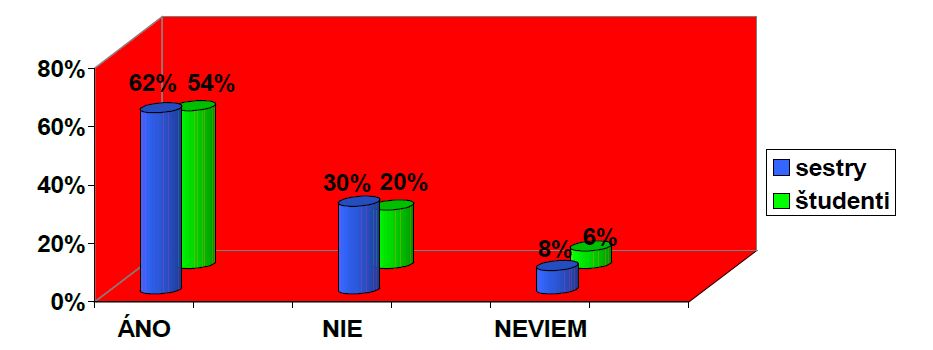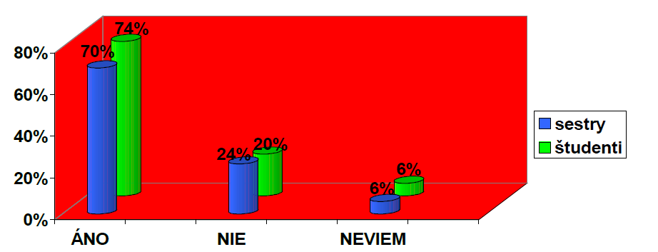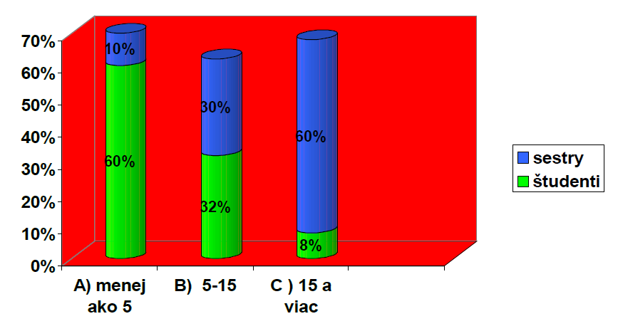 Graf 7 zobrazuje, že v skupine sestier sa 10 % stretlo s menej ako piatimi úmrtiami pacienta na pracovisku, 30 % sa stretlo s úmrtiami pacientov v rozmedzí od 5- 15 a 60 % sa stretlo s viac ako pätnástimi úmrtiami pacienta na pracovisku. V skupine študentov 60 % opýtaných študentiek sa stretlo s úmrtím menej ako 5 krát, 32 % sa stretlo s počtom úmrtí od 5 až do 15, 8 % oslovených sa stretlo s viac ako pätnástimi úmrtiami na pracovisku.