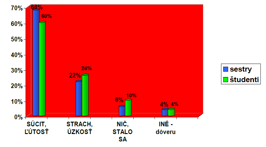 Graf 9 znázorňuje, že v skupine sestier 70 % prežívajú súcit s ľútosťou, 4 % sa vyjadrili že prežívajú strach s úzkosťou, 26 % zvolilo možnosť, že nič zvláštne neprežívali.