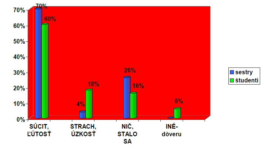 V skupine študentiek 60 % prežíva súcit s ľútosťou, 18 % prežíva strach a úzkosť, 16 % sa vyjadrilo, že nič zvláštne neprežívali a 6 % zvolilo možnosť iné ktorú označili ako dôveru.