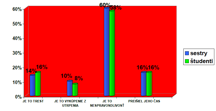 Graf 10 ilustruje možnosti názorov: V skupine sestier možnosť je to trest zvolilo 14 % respondentiek, možnosť vykúpenie z utrpenia zvolilo 10 % sestier, za nespravodlivosť to považuje 60 % opýtaných sestier 16 % sestier má názor, že prišiel jeho čas. V skupine študentiek 16 % má pocit, že je to trest, 8 % zvolilo možnosť vykúpenie z utrpenia 58 % študentiek má názor, že je nespravodlivosť a 16 % opýtaných respondentiek o úmrtí mladého človeka si myslí, že prišiel jeho čas.