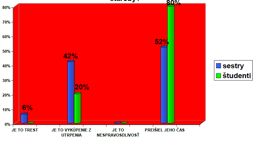 Graf 11 ilustruje možnosti názorov: V skupine sestier možnosť je to trest zvolilo 6 % respondentiek, možnosť vykúpenie z utrpenia zvolilo 42 % sestier, za nespravodlivosť úmrtie staršieho človeka nepovažuje žiadna z opýtaných sestier 52 %sestier má názor, že prišiel jeho čas. V skupine študentiek úmrtie staršieho človeka nemá žiadna z opýtaných pocit, že je to trest, 20 % zvolilo možnosť vykúpenie z utrpenia, žiadna z opýtaných študentiek nemá názor, že je to nespravodlivosť a až 80 % opýtaných respondentiek o úmrtí človeka v období staroby si myslí, že prišiel jeho čas.