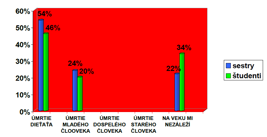 V skupine študentiek sa 2 % častejšie stretli s úmrtím detí, 14 % opýtaných študentiek sa častejšie stretlo s úmrtím dospelých, 84 % sa častejšie stretlo s úmrtím starých ľudí.