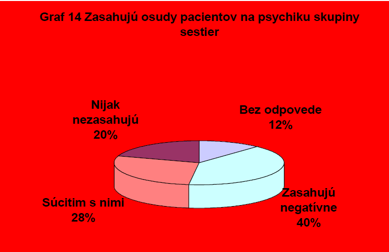 Graf 14 V Skupine sestier 26 % neodpovedalo, na 20 % zasahujú negatívne, 28 % sestier sa stavia profesionálne a 26 % sestier osudy pacientov nijak nezasahujú.