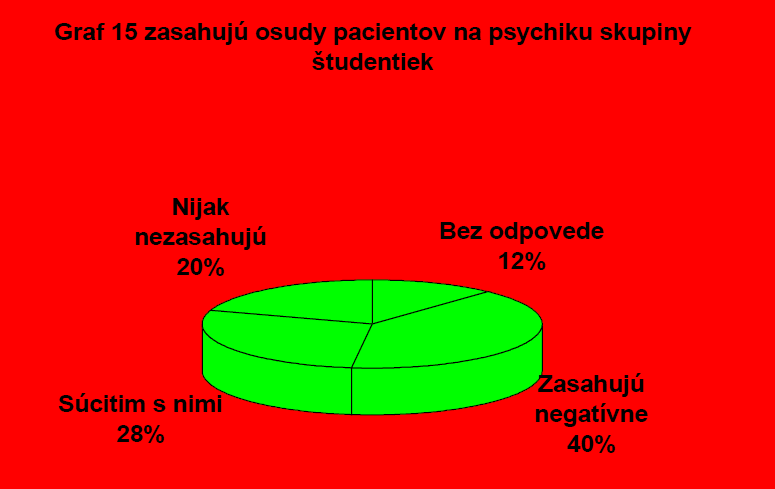 Graf 15 V Skupine študentiek 12 % neodpovedalo, na 40 % zasahujú negatívne, 28 % študentiek s nimi súcití a 20 % sestier osudy pacientov nijak nezasahujú.