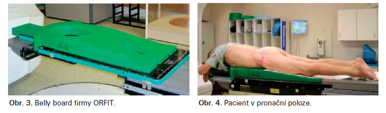 Na onkologickém odd. Nemocnice České Budějovice, a. s. se používá pronační ozařovací poloha s fixací v belly boardu při ozařování pánve od r. 1994 u vybraných rizikových pacientů. Nejdříve jsme používali podložní polystyrénovou desku (180x60x8 cm) s otvorem pro břicho, vyrobenou našimi techniky přímo pro daného pacienta (obr. 1, 2).