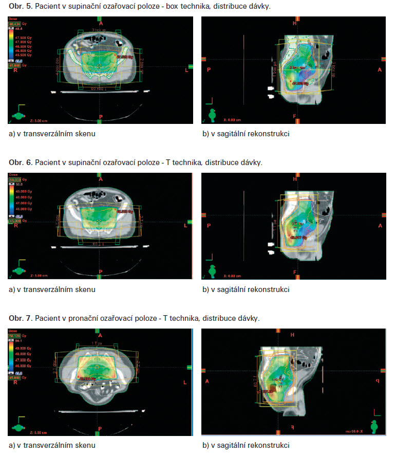V případě, že se u pacienta zjistí některá z indikací pro pronační polohu v belly boardu, provádíme plánování v obou polohách technikami box (obr. 5a,b) a T (obr. 6a,b) pro supinaci a T techniku pro pronaci (obr. 7a,b).