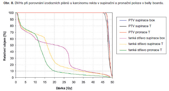 Vyhodnocení izodózního plánu je provedeno pomocí DVH (dose volume histogram) - podle dálkového pokrytí PTV a objemu kliček tenkého střeva (obr. 8)