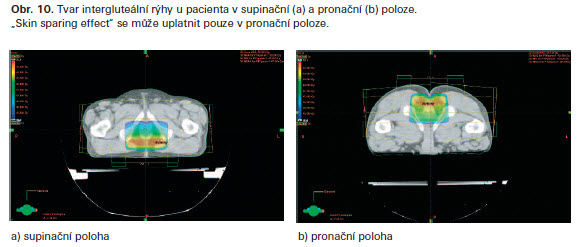 Zejména u obézních pacientů se v pronační poloze snižuje dávka záření v intergluteální oblasti a samozřejmě i v kožních řasách v podbřišku, tím se snižuje i kožní poiradiační reakce (obr. 10 a, b).