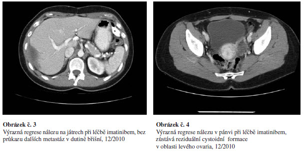 Výkonnostní stav 34 leté pacientky s recidivujícím c-kit negativním GISTem je 80%. Poslední dny ji trápí prakticky trvalé kolísavě intenzivní bolesti břicha s propagací do zad, někdy i do pravého ramene. Bolesti, vyžadují nasazení analgetické medikace, jsou výrazně horší v noci, vleže. I přes značný rozsah onemocnění jsou laboratorní parametry v normě. Vzhledem k histologické povaze onemocnění a průkaz mutace PDGFR i přes c-kit negativitu (viz doporučení SPC) byla indikována léčba imatinibem v dávce 400 mg/den. Jelikož lék nebyl vzhledem k indikačním omezením pacientce hrazen z prostředků veřejného zdravotního pojištění, byl imatinib (Glivec) poskytnut firmou Novartis. V průběhu terapie nebyly zaznamenány žádné abnormality v laboratorních parametrech, do 2 týdnů od zahájení terapie dochází k vymizení algického břišního syndromu. Léčba imatinibem, jak prokázala následná série provedených vyšetření, byla efektivní a to ve všech dokumentovaných metastatických lokalitách.