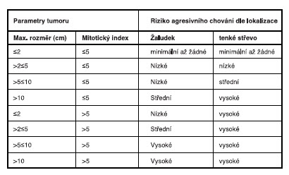 21 (72%) tumorů bylo lokalizováno v žaludku, 5 (17%) v tenkém střevě, dva (7%) v jícnu a jeden v gastrokolickém ligamentu. Průměrná velikost tumorů byla 54 mm. Největší tumor dosahoval 140 mm a vyrůstal ze zadní stěny žaludku. 7% nádorů vykazovalo velmi nízké, 62% nízké, 20% střední a 11% vysoké riziko agresivního chování.