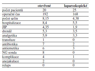 Ze srovnání výsledků obou technik MRPLND svědčí pro laparoskopickou techniku kratší celková hospitalizace i pobyt na JIP, kratší čas pooperační drenáže retroperitonea, nižší potřeba analgetik, antiemetik a antibiotik. U dvou pacientů po otevřené RPLND došlo k výskytu anejakulace. Při laparoskopické MRPLND (LMRPLND) jsme nezaznamenali vážnější pooperační komplikace ani výskyt pooperační anejakulace. Operační časy obou technik byly srovnatelné. Při mediánu sledování 28 měsíců pro LMRPLND a 65 měsíců pro otevřené RPLND, nedošlo k relapsu onemocnění ani u jednoho ze sledovaných pacientů v obou skupinách.
