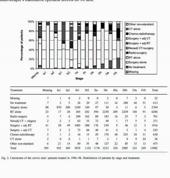 Další tabulka hodnotí různé léčebné modality podle pokročilosti onemocnění. Nejfrekventovanější metodou je samotná radioterapie téměř v 50% případů, další nejčastější metodou je v asi 20% operační léčba. Za pozornost stojí čtvrtá nejčastější léčebná modalita t.j radioterapie s následnou operační léčbou do 60 dnů.