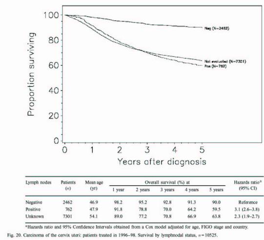 Následující tabulka hodnotí přežívání ve vztahu ke stavu lymfatických uzlin. Rozdíl je zcela evidentní.