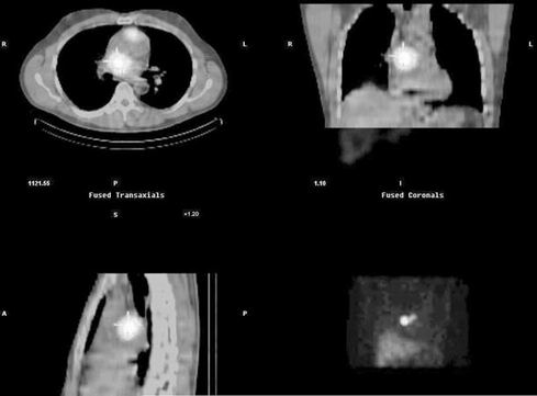 Obr. 2: Snímky SPECT/CT na kterých se zobrazují dvě akumulující ložiska, která jsou uložená prekardiálně a retrokardiálně.