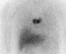 Statický snímek hrudníku v přední projekci. Zobrazují se dvě ložiska patologické akumulace v mediastinu.