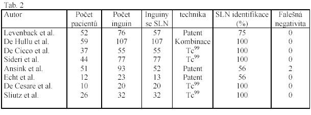 Aktuálním, standardním léčebným postupem je široká, lokální excize s uni nebo bilaterální lymfadenektomií. Modifikovaná, radikální vulvektomie je indikovaná pro centrální léze, pro pacientky s multifokální lézí nebo pro případy, kde konzervativní léčba vzhledem k anatomickým poměrům není možná. Unilaterální lymfadenektomie se doporučuje u pacientek, kde léze je lokalizována minimálně 1 cm od střední čáry. Samotná chirurgická léčba přináší stále, i při modifikacích poměrně výraznou, poléčebnou morbiditu. U časných stádií, kde je indikována lymfadenektomie se dostáváme do situace, kdy u cca 70% pacientek jsou uzliny negativní. Tzn., že tyto pacientky neprofitují z provedené lymfadenektomie, ale mají na druhou stranu vysoké riziko pro rozvoj pooperačních komplikací. Bohužel, jakákoliv jiná detekce lymfatických uzlin než histopatologická nemá klinický význam. Tato situace vede k neúměrně vysoké morbiditě léčby. Koncept sentinelové uzliny, tak jak jej známe z chirurgické léčby prsu nebo melanomu se nabízí jako výhodná alternativa. Aktuálně se k detekci sentinelových lymfatických uzlin (Sentinel Lymph Node Mapping - SLNM) u vulvárního karcinomu používá dvou metod – patentová modř (Patent blau) nebo radioaktivně značený koloid technecia Tc99, event. kombinace obou technik, viz. Tab. 2.