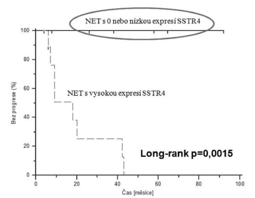 Medián terapie analogy činí ke dnešnímu datu 14 měsíců. Vzhledem k vlivu rozložení exprese jednotlivých typů somatostatinových receptorů na radiologickou odpověď a parametry přežití pacientů s NET léčených SA jsme nepozorovali očekávaný prediktivní význam exprese receptorů SSTR2 a SSTR5. Jako první jsme ovšem identifikovali silný potenciál hladin mRNA pro SSTR4 predikovat čas do progrese (TTP, p=0,0015, obr. 1) a radiologickou odpověď (p=0,05). Pacienti s lepším přežitím měli výrazně sníženou převážně nulovou hladinu mRNA pro SSTR4. Vzhledem k tomu, že efekt SA je realizován především přes receptory SSTR2 a SSTR5, možným mechanismem vysvětlujícím tato pozorování by mohla být schopnost receptoru SSTR4 heteredimerizovat s SSTR2 nebo SSTR5 a blokovat tak terapeutický účinek SA. Schopnost somatostatinových receptorů dimerizovat již byla v minulosti popsána.
