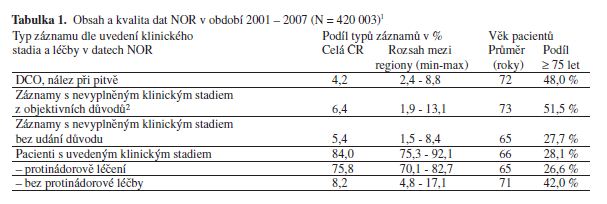 Při rozboru kvality dat NOR si musíme uvědomit, že jde o populační epidemiologický registr, který obsahuje všechna hlášení o novotvarech. Všechny záznamy nemohou být úplné v diagnostických parametrech, neboť tyto údaje není někdy možné z objektivních důvodů stanovit (záznamy DCO, nálezy při pitvě, velmi časná úmrtí, odmítnutí péče pacientem, apod.). NOR umožňuje tyto objektivní důvody analyzovat a oddělit je od skutečně chybných a neúplných záznamů, jak dokládá tabulka 1. Závěr analýzy je velmi potěšující. Recentní data NOR obsahují pouze 5,4 % záznamů, kde není uvedeno klinické stadium a přitom tento fakt nelze objektivně zdůvodnit. Rovněž regionální rozptyl kvality dat NOR je přijatelný. Kvalita NOR v čase postupně roste, což je vynikající vizitka práce všech správců dat, kteří se NOR věnují.