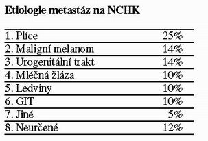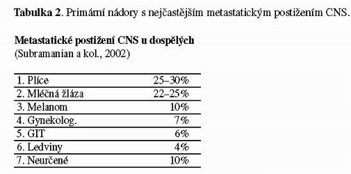 Mezi primární nádorové onemocnění, které vytvářejí nejčastěji mozkové metastázy patří nádory plic a mléčné žlázy. Studie London Hospital uvádí dokonce 72% výskyt primárního plicního tumoru u pacientů s mozkovými metastázami. V posledních letech narůstá četnost metastatického postižení CNS při maligním melanomu. Přehled literárních údajů uvádí tabulka 2.