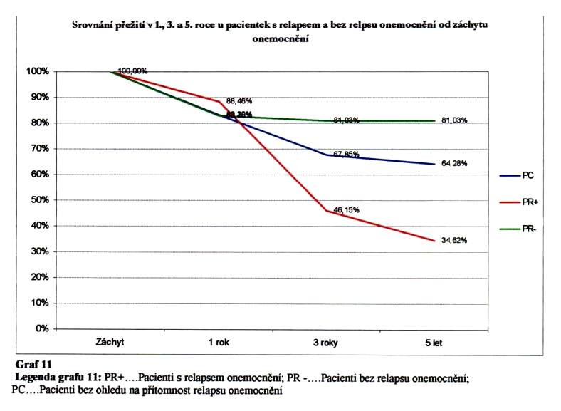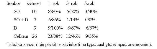 Z celkového počtu 26 pacientek s relapsem zemřelo na tento relaps 18. Ve skupině 10 pacientek s relapsem, které měly potíže a přišly samy (SO) bylo 7 úmrtí, ve skupině 7 pacientek, které měly potíže, ale přišly až na dispenzární kontrolu (SO+D) bylo nejkratší přežití (celkem 22 měsíců) a pacientky zemřely všechny. Poslední skupina 9 pacientek, které byly bez potíží a relaps byl zjištěn při dispenzarizaci (D) zemřely 4 a v této skupině bylo nejméně úmrtí.