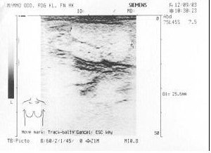 hypoechogenní, velkého rozsahu, ostře ohraničené. Vzhledově tumor