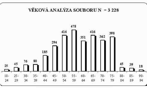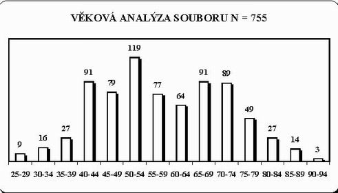 Věková analýza souboru 3 228 pacientek s karcinomem mléčné žlázy je uvedena v Graf 2. Je zajímavá incidence karcinomu ve věkové skupině 40 – 44 let a ve skupině 50 – 54 let věku pacientky.