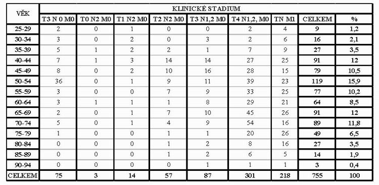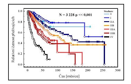 je uvedena v Graf 1 a Tab.1. Tab. 1 analyzuje současně soubor v závislosti na klinických stádiích.
