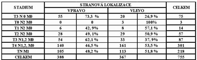 je uvedena v Tab. 2. Klinické stádium T3 N0 M0, T2 N2 M0, T3 N1,2 M0 jsou výrazně častěji zaznamenané vpravo, stádium T4 N1,2 M0 a TX NX M1 vlevo. Výsledky této analýzy jsou zcela odlišné od výsledku získaného při analýze souboru 3 228 pacientek s diagnózou karcinomu mléčné žlázy.