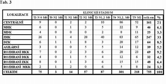 je uvedena v Tab. 3. Nejvyšší počet pokročilých stádií karcinomu mléčné žlázy byl zaznamenán v zevním horním kvadrantu, centrálně, na rozhraní horních kvadrantů a v dolním zevním kvadrantu.
