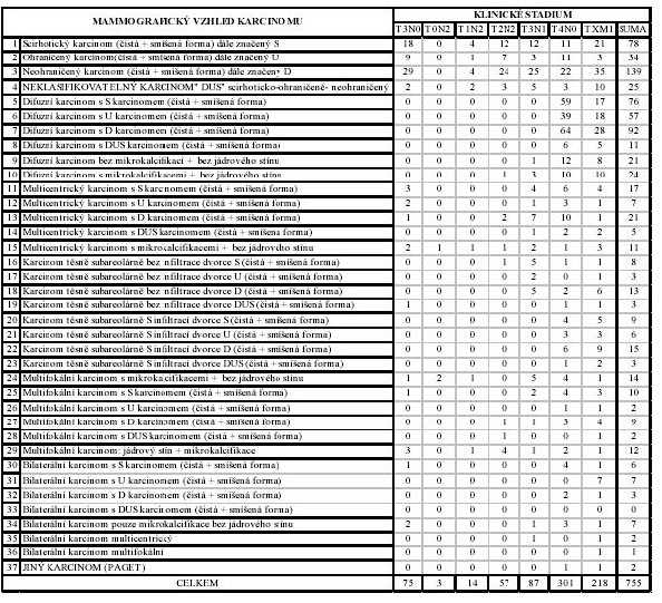 Uvedená data nevystihují celou klasifikační šíři mammografického vzhledu karcinomu, tato detailní klasifikace je již mimo rámec sdělení.