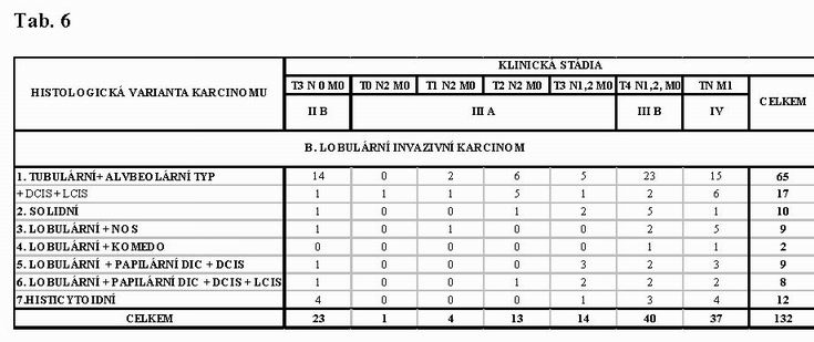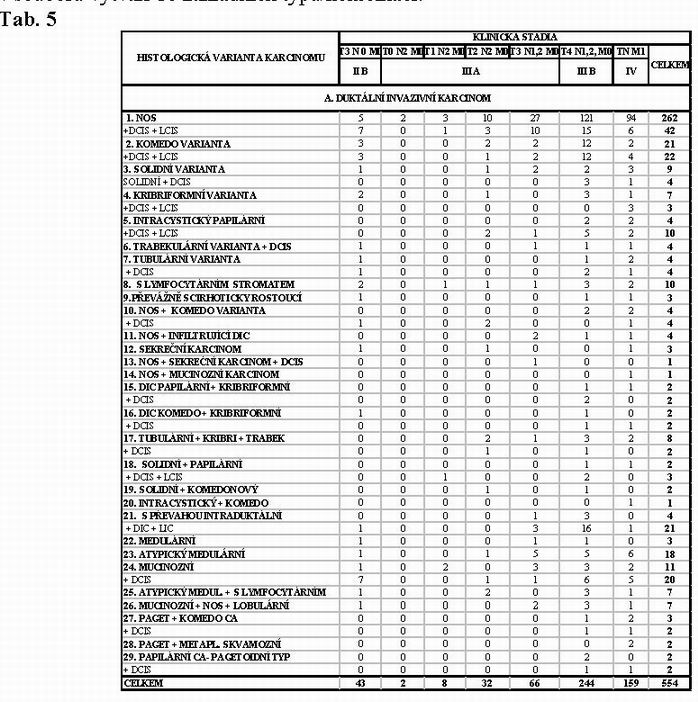 a jeho varianty včetně výskytu in situ karcinomů (DCIS, LCIS) je uveden v Tab. 5. Duktální invazivní karcinom a jeho varianty byly průkazné v 74%, lobulární invazní karcinom a jeho varianty v 17% a jiný histologický typ karcinomu mléčné žlázy byl průkazný v 9%.
