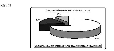 Výskyt jednotlivých forem karcinomu mléčné žlázy v % je uveden v Graf 3. Graf nerozlišuje současný výskyt DCIC / LCIS.