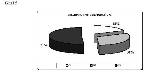 invazivních karcinomů procentuálně je uveden v Graf 4, Graf 5 uvádí grading in situ karcinomů mléčné žlázy. Byl zaznamenán vyšší počet karcinomů s vyšším/středním Grade a to jak u invazivních karcinomů, tak i karcinomů in situ.