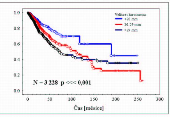 Byla prokázaná pozitivní korelace mezi velikostí karcinomu a délkou PFI a OS.