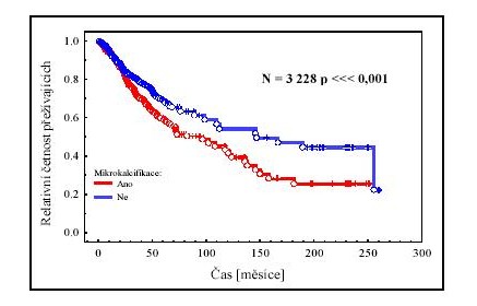 Přítomnost mikrokalcifikací v jádrovém stínu karcinomu mléčné žlázy signifikantně zkracuje délku PFI, OS.